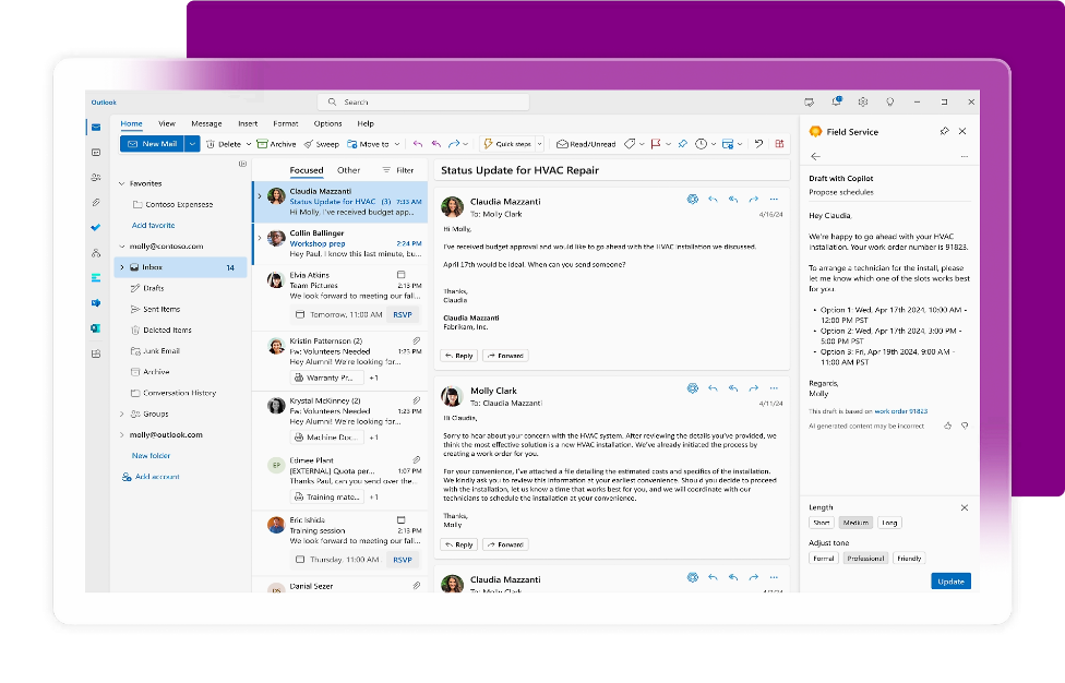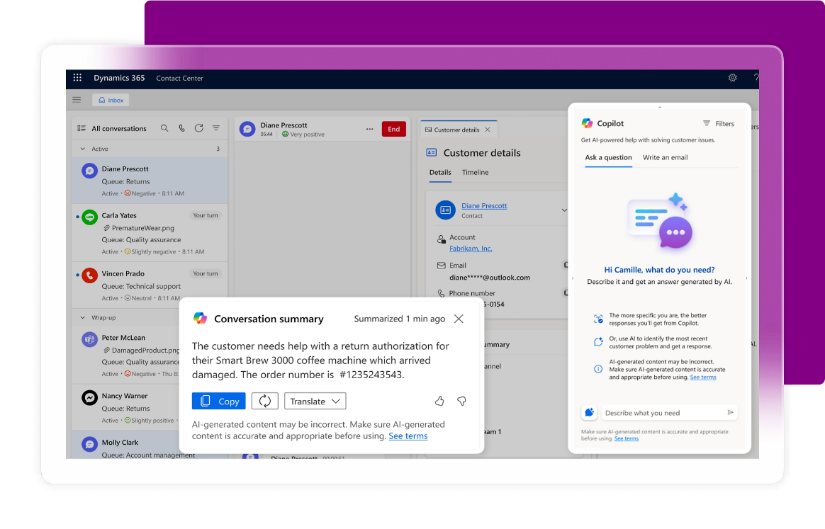 Help dispatchers and field techs create work orders, optimize schedules, and inform customers with Copilot and agents now in preview in Dynamics 365 Field Service. Also, connect field operations with your contact center for faster issue resolution and more unified experiences.